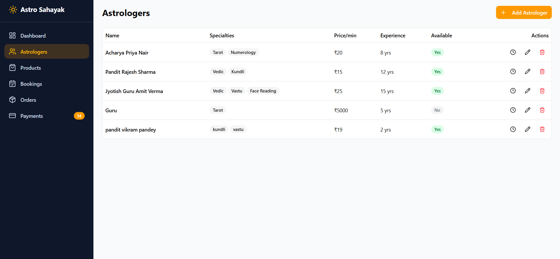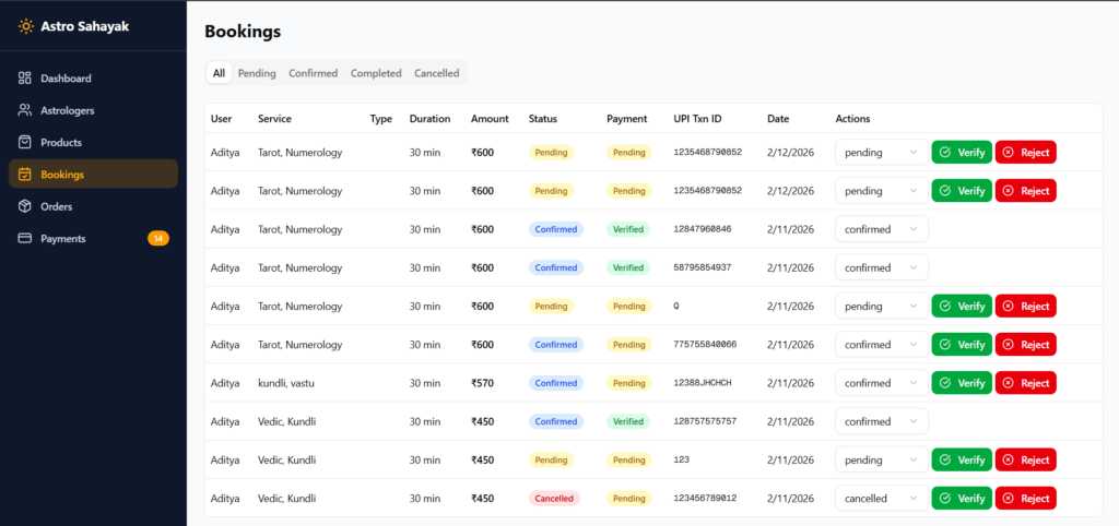 Centralized Admin Panel to manage users, astrologers, bookings, content, products, and system settings.