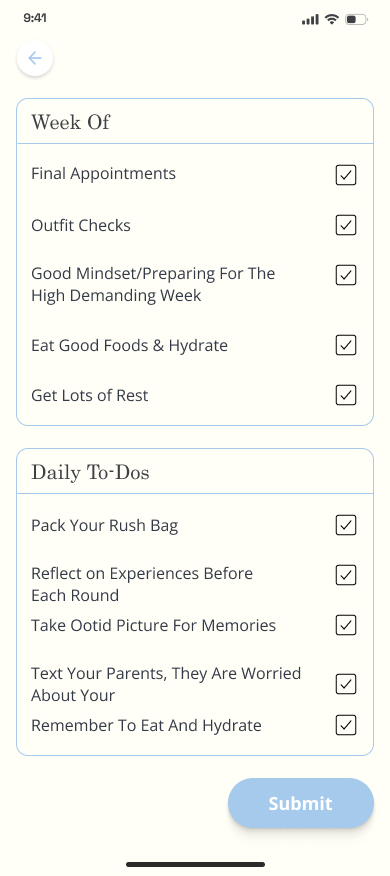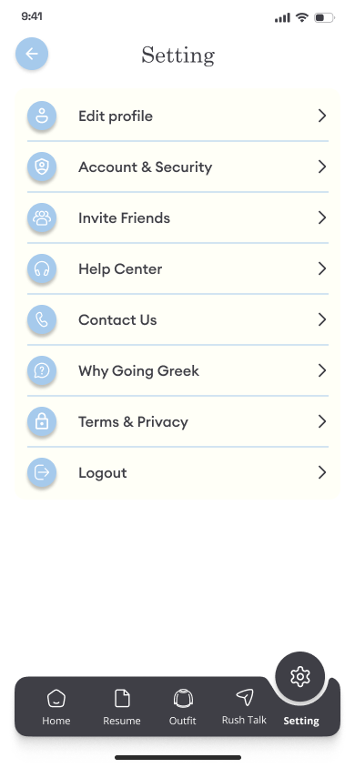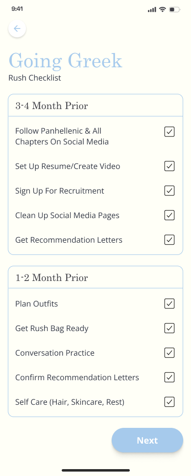 A mobile-focused Greek Life recruitment app built specifically for students preparing for sorority recruitment, with tools tailored to a competitive and time-sensitive admissions journey.